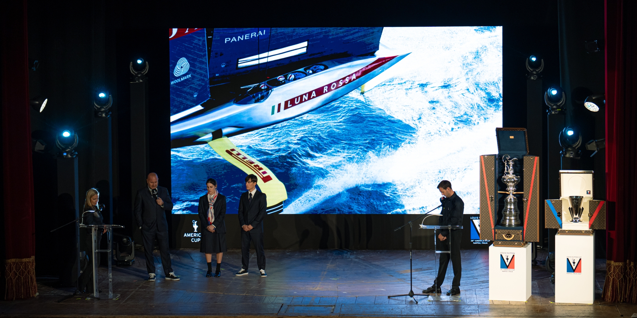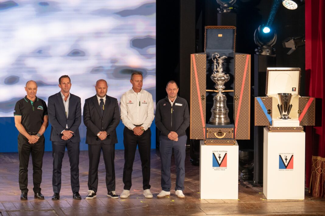 C’est au Palazzo Real, le Palais royal de Naples, que s’est déroulée ce mercredi la présentation des 5 équipes fondatrices de l’America’s Cup Partnership en présence des autorités nationales et locales italiennes. La Coupe de l’America et la Coupe Louis Vuitton ont été présentées sur scène de manière théâtrale avant que les représentants du Defender – Grant Dalton, CEO of Emirates Team New Zealand, David Blakey, Commodore du RNZYS et les représentants du Challenger of Record, Sir Ben Ainslie, Directeur de GB1 et Bertie Bicket, Commodore du Royal Yacht Squadron montent sur scène pour expliquer en quelques phrases ce tournant majeur de l’America’s Cup Parnership.